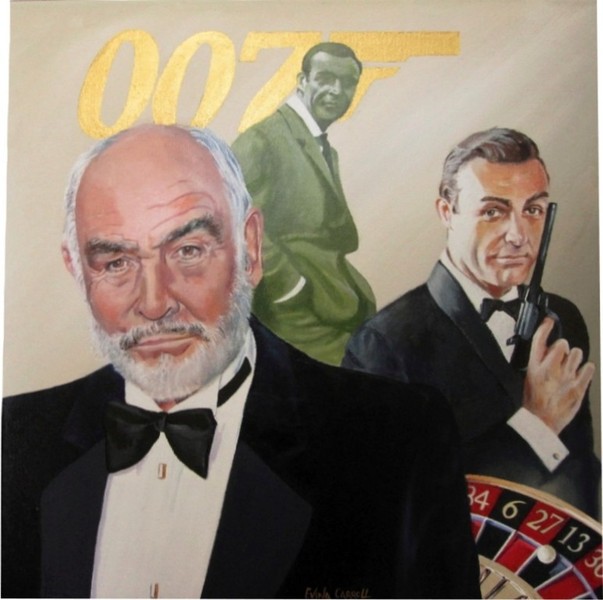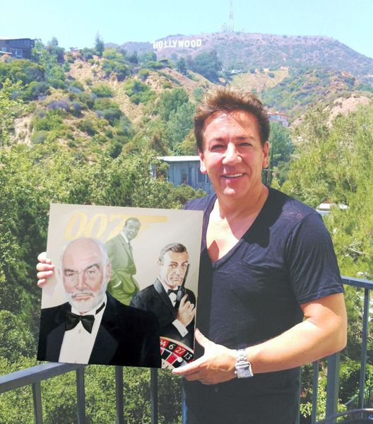 The collage-esque canvas I created for my Sean Connery/ James Bond tribute was quite a challenge. I wanted to capture the different ages of the veteran actor Connery, and simultaneously the Bond character himself. The said painting now very aptly hangs in the beautiful home of a well-known TV personality within clear visual distance of the Hollywood Sign - the movie capital of the world.